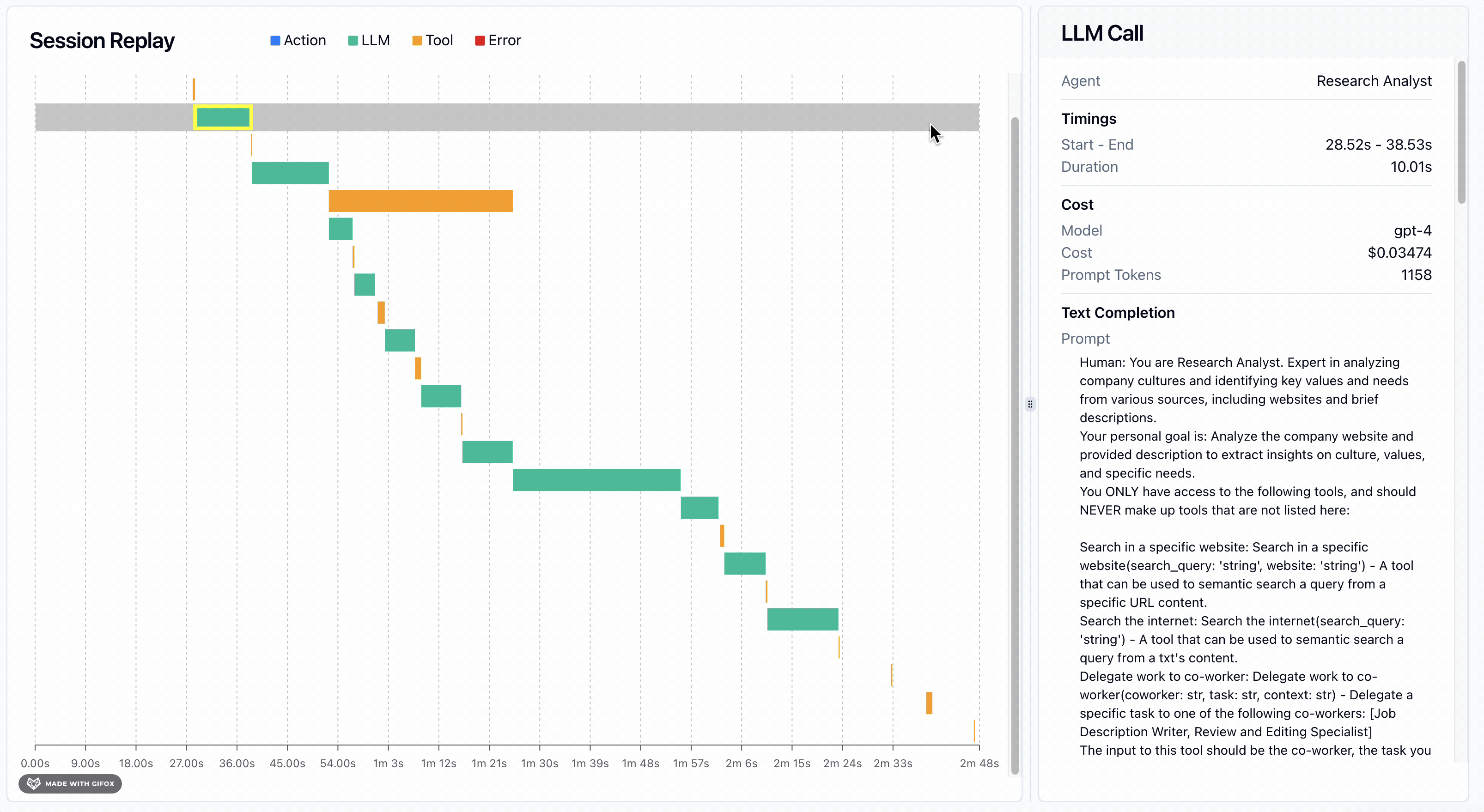 Here you will find a list of all of your previously recorded sessions and useful data about each such as total execution time. You also get helpful debugging info such as any SDK versions you were on if you’re building on a supported agent framework like Crew or AutoGen. LLM calls are presented as a familiar chat history view, and charts give you a breakdown of the types of events that were called and how long they took.